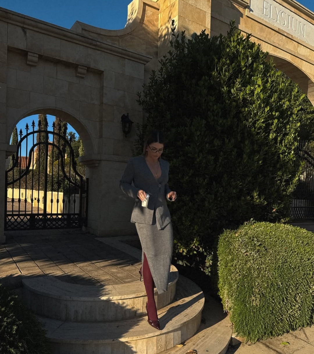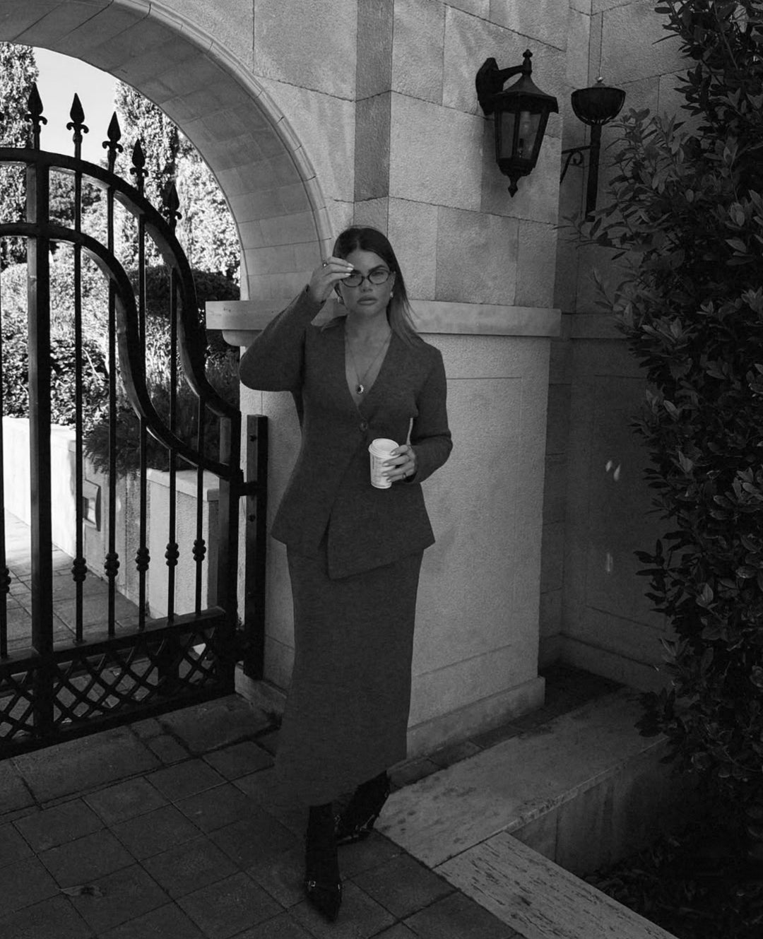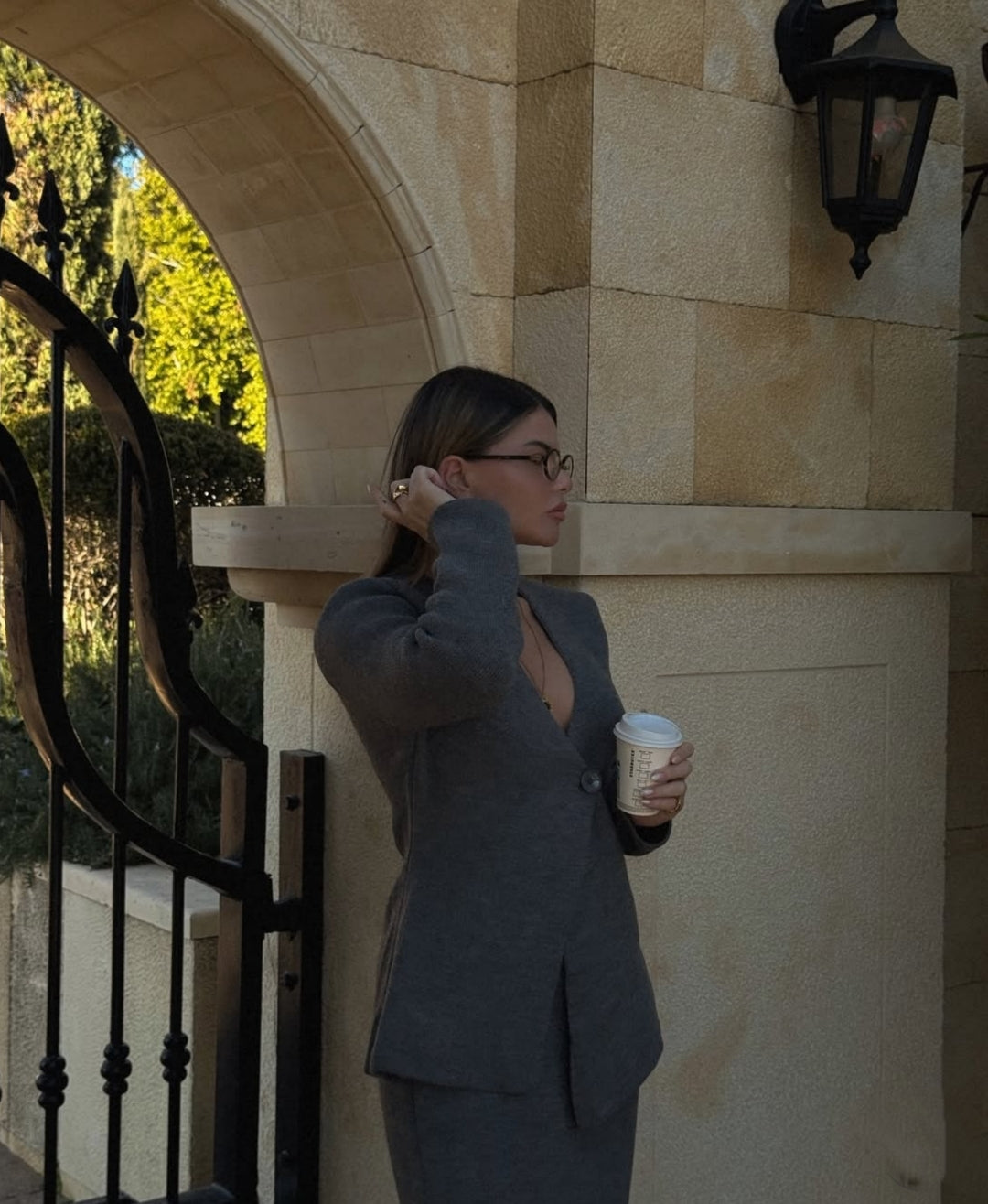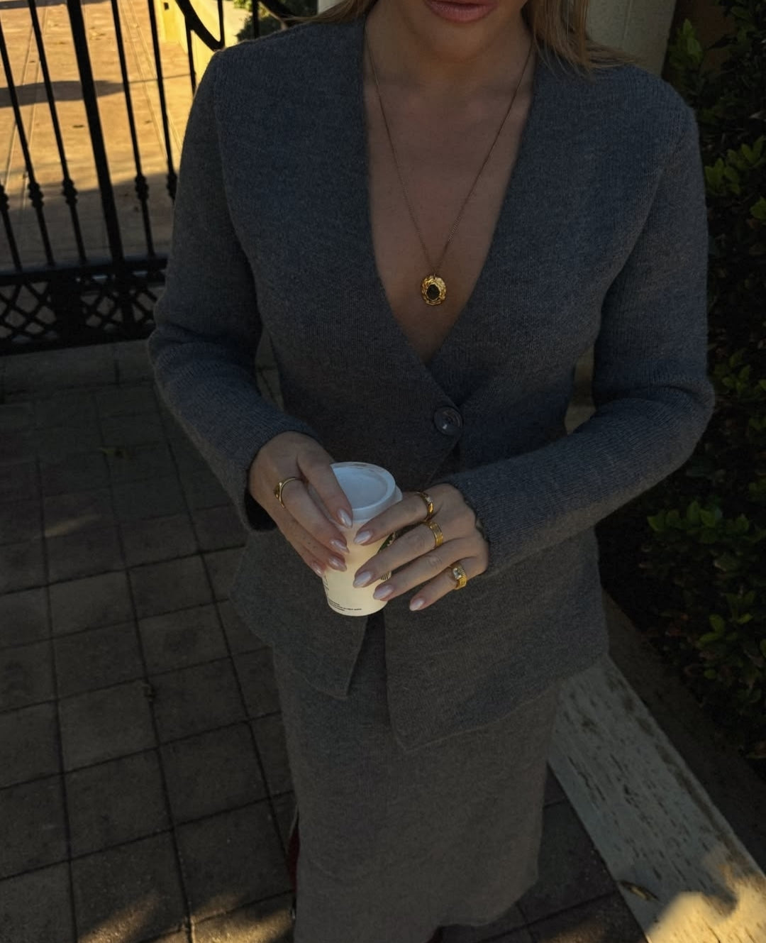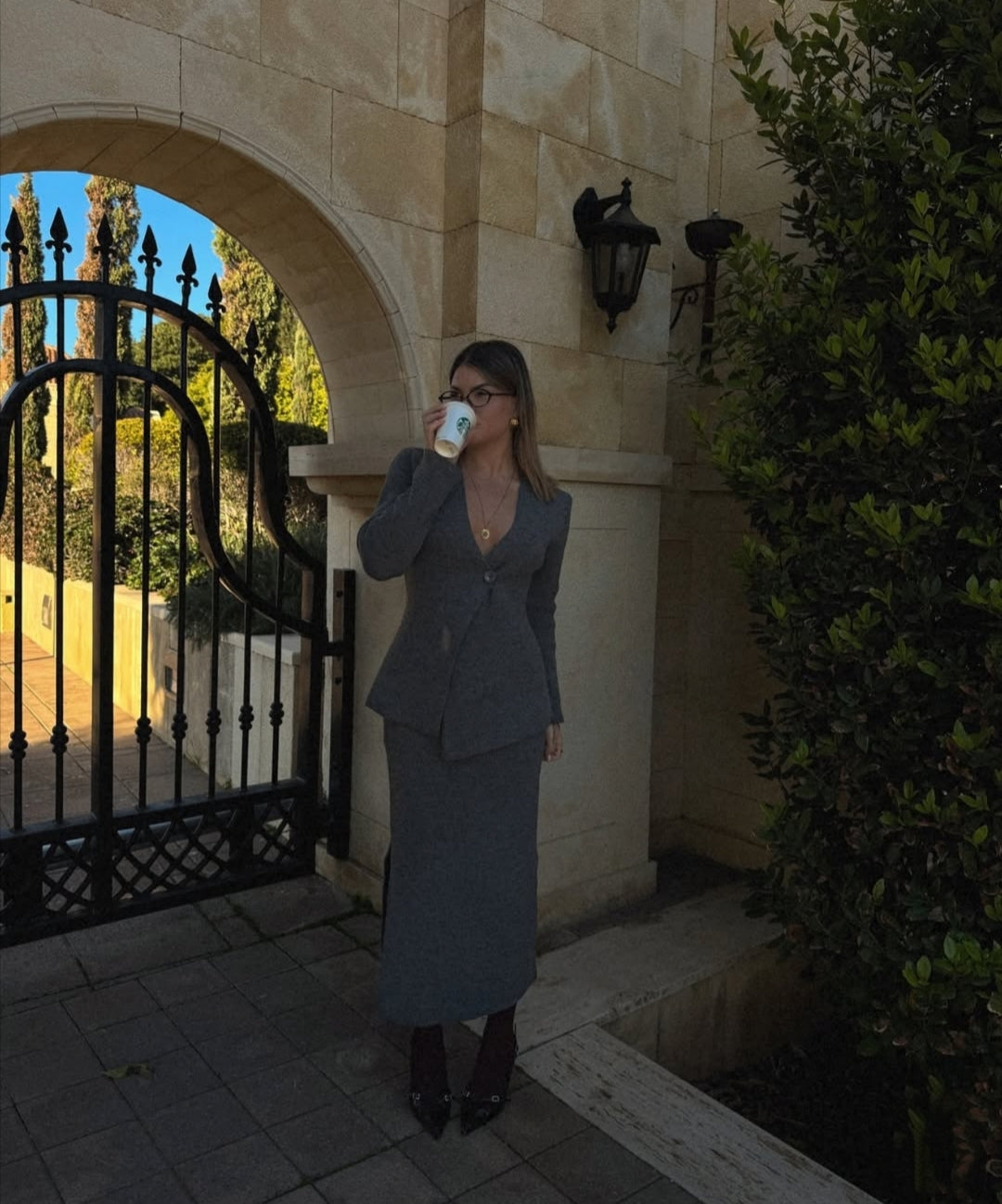 Long-sleeved and flared vest knitted set, crossed vest, tie with one button. Mid-length skirt with slit.